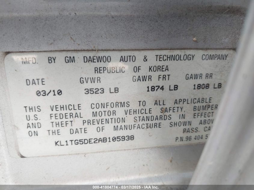 Color SilverCylinders 4Drive Front wheel driveVIN KL1TG5DE2AB******State Run & Drive VerifiedDamage Front or back AutoRIA
