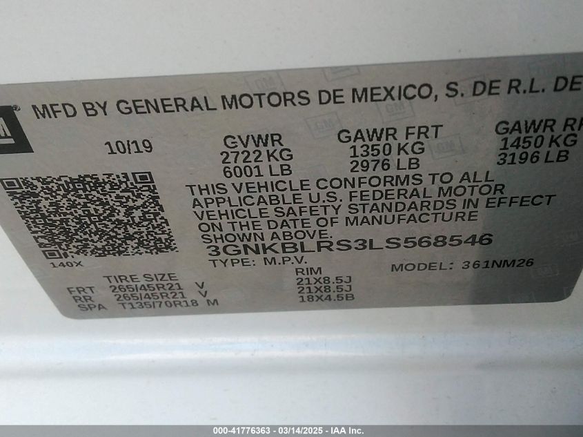 Color WhiteCylinders 6Drive Full driveVIN 3GNKBLRS3LS******State Run & Drive VerifiedDamage Back AutoRIA