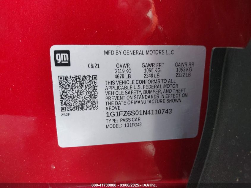 Color RedDrive Front wheel driveVIN 1G1FZ6S01N4******State Run & Drive VerifiedDamage Left sideAuction date 2025-03-21 AutoRIA
