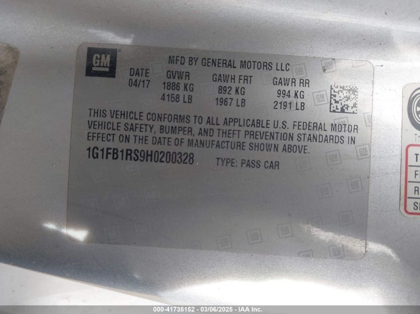 Color GrayCylinders 6Drive Rear wheel driveVIN 1G1FB1RS9H0******State Run & Drive VerifiedDamage Front or back AutoRIA