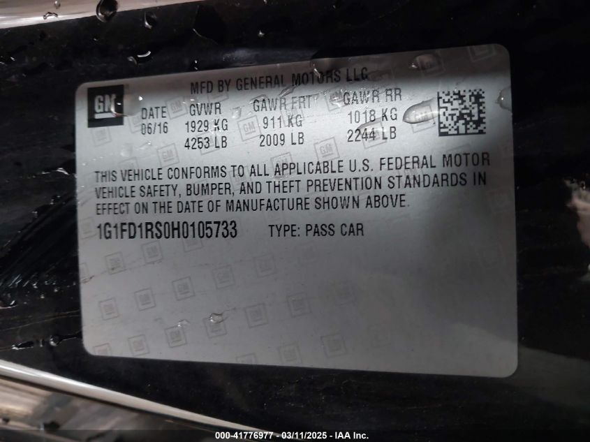 Color BlackCylinders 6Drive Rear wheel driveVIN 1G1FD1RS0H0******State Run & Drive VerifiedDamage Right side AutoRIA