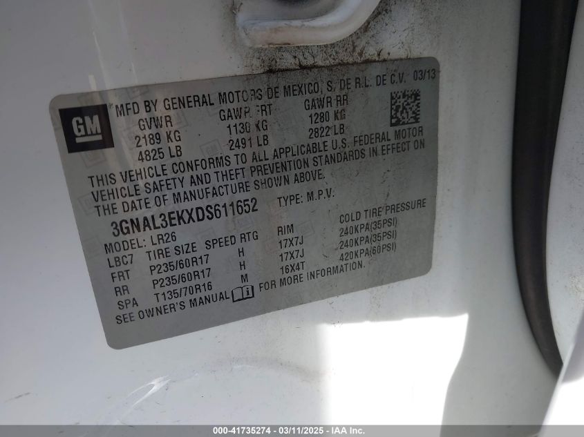 Color WhiteCylinders 4Drive Front wheel driveVIN 3GNAL3EKXDS******State Run & Drive VerifiedDamage InsignificantAuction date 2025-03-25 AutoRIA