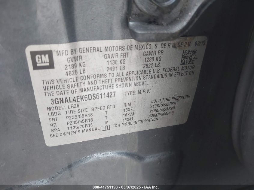 Color GrayCylinders 4Drive Front wheel driveVIN 3GNAL4EK6DS******State Run & Drive VerifiedDamage Right sideAuction date 2025-03-25 AutoRIA
