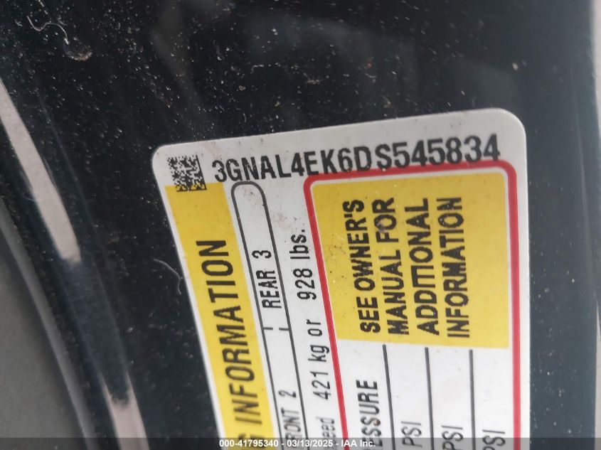 Color BlackCylinders 4Drive Front wheel driveVIN 3GNAL4EK6DS******State Run & Drive VerifiedDamage Rear rightAuction date 2025-03-25 AutoRIA