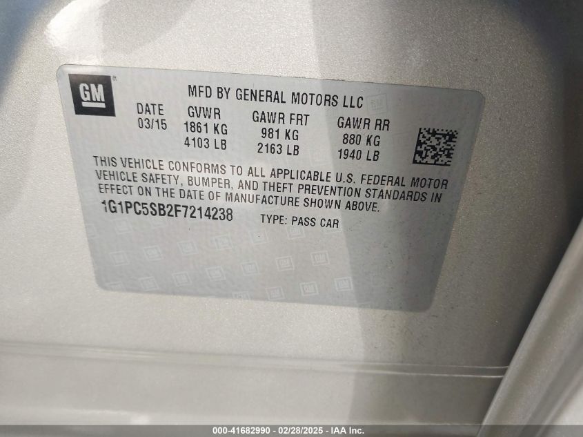 2015 CHEVROLET CRUZE 2015 Gasoline, 1.4, Front wheel drive, VIN - 1G1PC5SB2F7****** from the USA