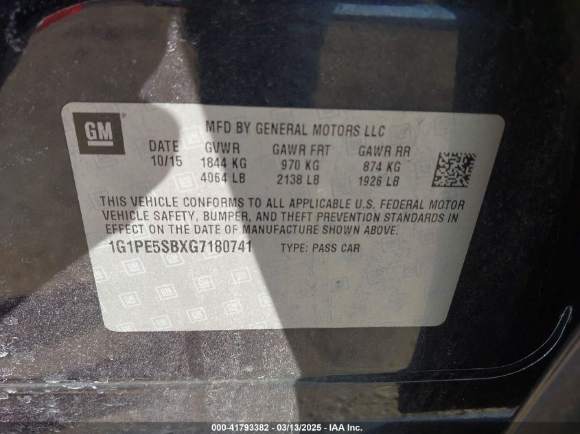 Color BlackCylinders 4Drive Front wheel driveVIN 1G1PE5SBXG7******State Run & Drive VerifiedDamage Left side AutoRIA