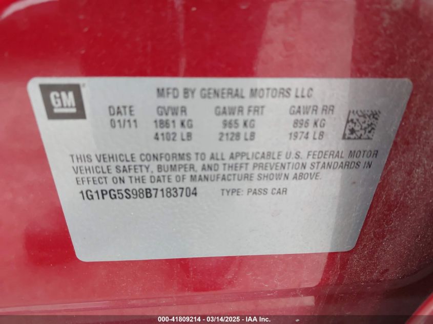 Color BurgundyCylinders 4Drive Front wheel driveVIN 1G1PG5S98B7******State Run & Drive VerifiedDamage InsignificantAuction date 2025-03-20 AutoRIA