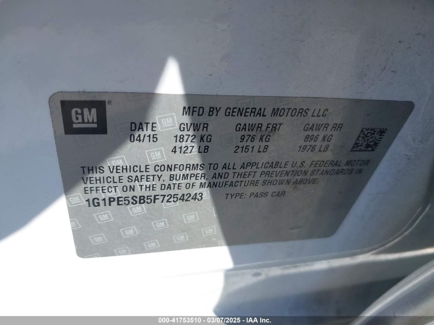 2015 CHEVROLET CRUZE 2015 Gasoline, 1.4, Front wheel drive, VIN - 1G1PE5SB5F7****** from the USA