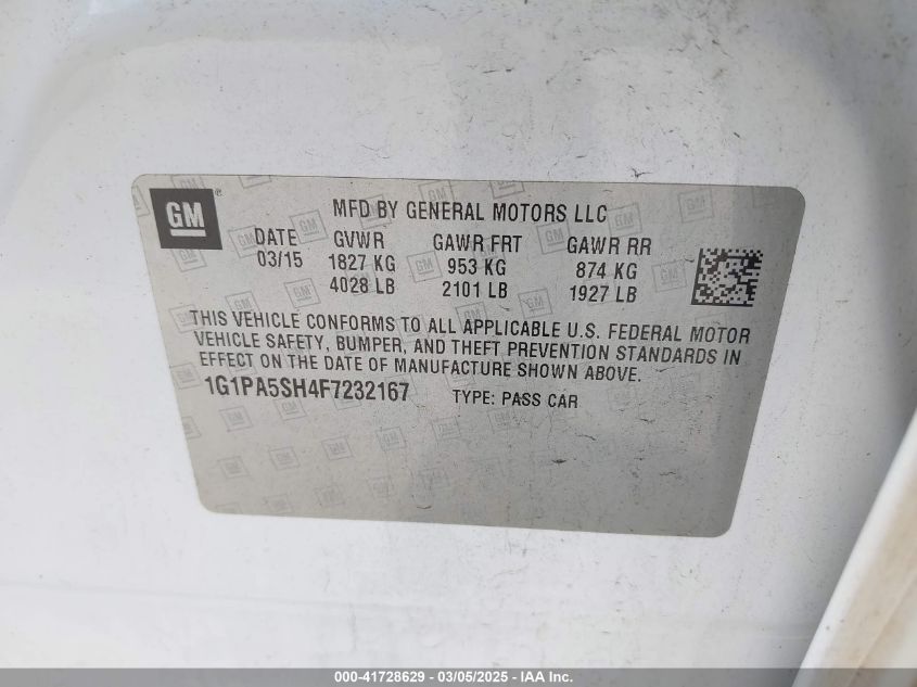 2015 CHEVROLET CRUZE 2015 Gasoline, 1.8, Front wheel drive, VIN - 1G1PA5SH4F7****** from the USA