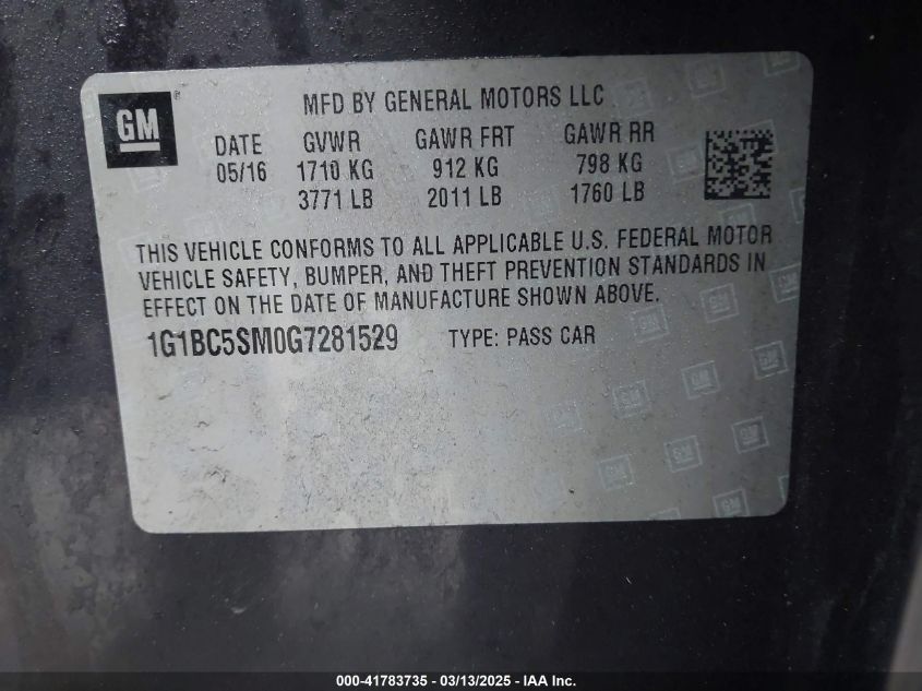Color BlackCylinders 4Drive Front wheel driveVIN 1G1BC5SM0G7******State Run & Drive VerifiedDamage Front or back AutoRIA