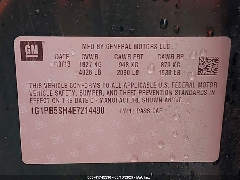 2014 CHEVROLET CRUZE 2014 Gasoline, 1.8, Front wheel drive, VIN - 1G1PB5SH4E7****** from the USA