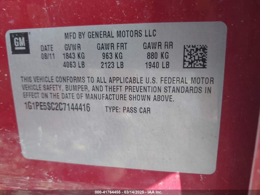 2012 CHEVROLET CRUZE 2012 Gasoline, 1.4, Front wheel drive, VIN - 1G1PE5SC2C7****** from the USA