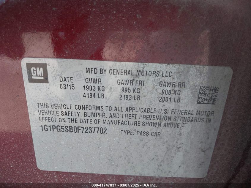 2015 CHEVROLET CRUZE 2015 Gasoline, 1.4, Front wheel drive, VIN - 1G1PG5SB0F7****** from the USA