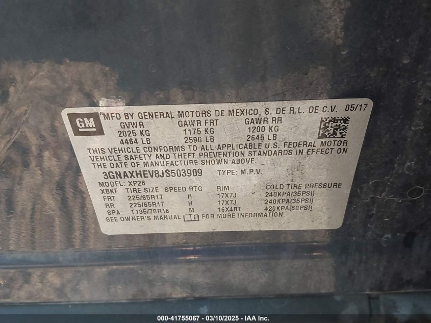 Color GrayCylinders 4Drive Front wheel driveVIN 3GNAXHEV8JS******State Run & Drive VerifiedDamage Front and backAuction date 2025-03-20 AutoRIA