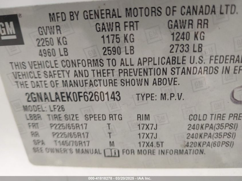 Color WhiteCylinders 4Drive Front wheel driveVIN 2GNALAEK0F6******State Run & Drive VerifiedDamage Insignificant AutoRIA