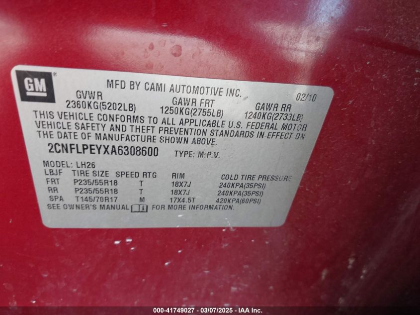 2010 CHEVROLET EQUINOX 2010 Gasoline, 3.0, Front wheel drive, VIN - 2CNFLPEYXA6****** from the USA