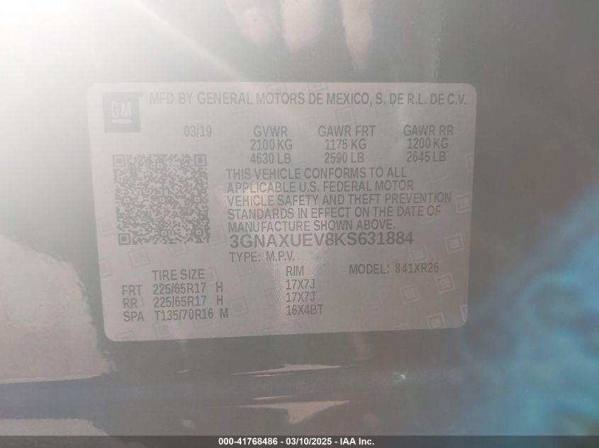 Color BlackCylinders 4Drive Full driveVIN 3GNAXUEV8KS******State Run & Drive VerifiedDamage Front or back AutoRIA