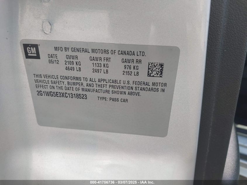 Color SilverCylinders 6Drive Front wheel driveVIN 2G1WG5E3XC1******State Run & Drive VerifiedDamage Insignificant