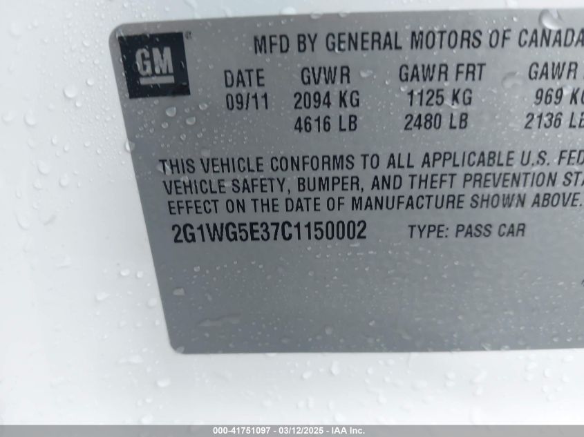 Color WhiteCylinders 6Drive Front wheel driveVIN 2G1WG5E37C1******State Run & Drive VerifiedDamage Front or back