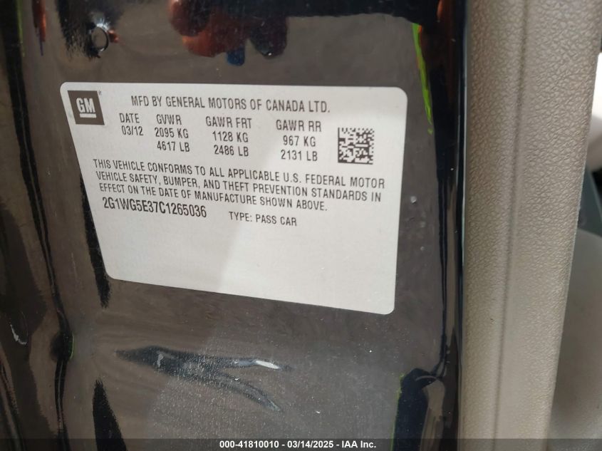 Color BlackCylinders 6Drive Front wheel driveVIN 2G1WG5E37C1******State Run & Drive VerifiedDamage Insignificant