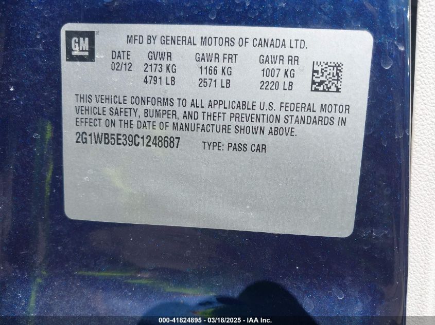 Color BlueCylinders 6Drive Front wheel driveVIN 2G1WB5E39C1******State Run & Drive VerifiedDamage InsignificantAuction date 2025-03-20