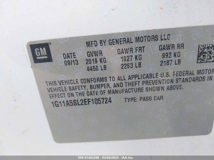 Color WhiteCylinders 4Drive Front wheel driveVIN 1G11A5SL2EF******State Run & Drive VerifiedDamage BackAuction date 2025-03-20 AutoRIA