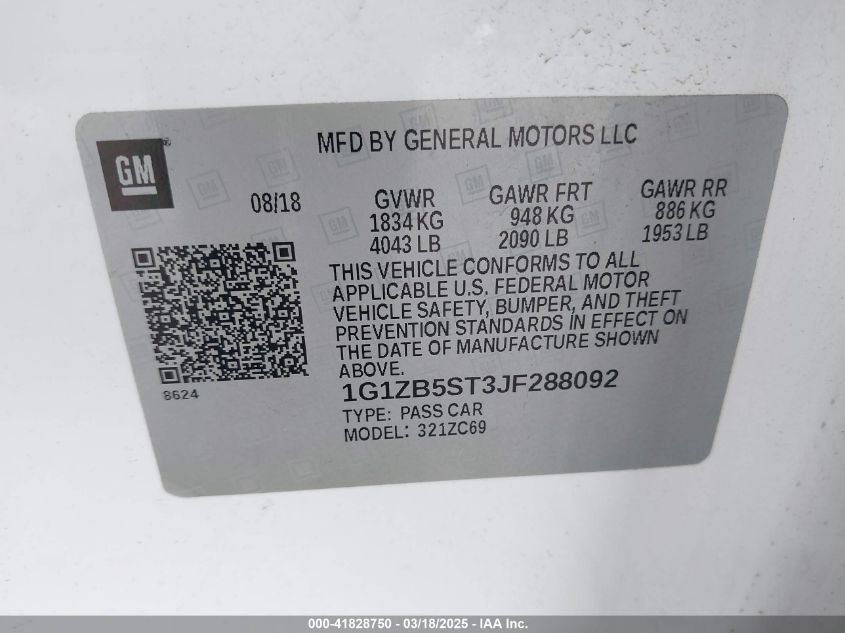 Color WhiteCylinders 4Drive Front wheel driveVIN 1G1ZB5ST3JF******State Run & Drive VerifiedDamage Front right AutoRIA