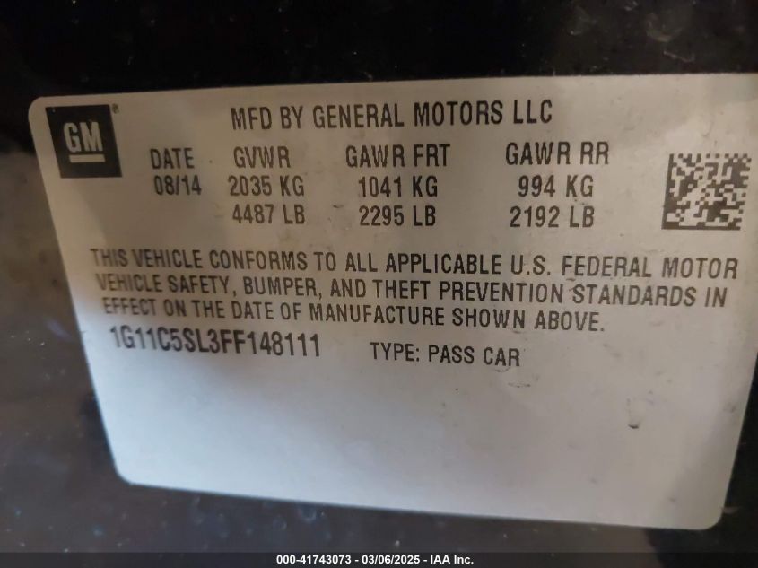 Color BlackCylinders 4Drive Front wheel driveVIN 1G11C5SL3FF******State Run & Drive VerifiedDamage Front or back AutoRIA