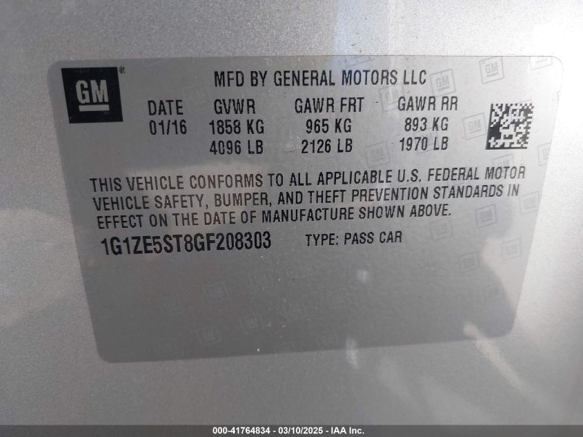 Color SilverCylinders 4Drive Front wheel driveVIN 1G1ZE5ST8GF******State Run & Drive VerifiedDamage Front left AutoRIA