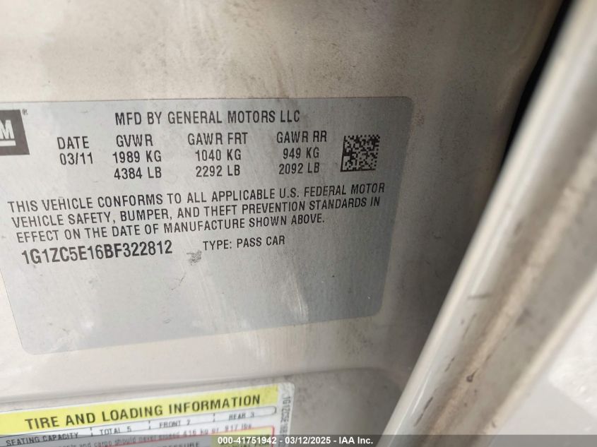 Color ChampagneCylinders 4Drive Front wheel driveVIN 1G1ZC5E16BF******State Run & Drive VerifiedDamage Left side