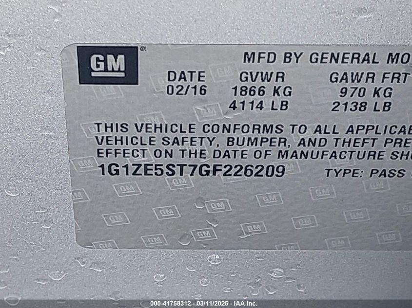 Color SilverCylinders 4Drive Front wheel driveVIN 1G1ZE5ST7GF******State Run & Drive VerifiedDamage Back AutoRIA