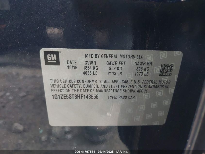 Color BlueCylinders 4Drive Front wheel driveVIN 1G1ZE5ST8HF******State Run & Drive VerifiedDamage Right side AutoRIA