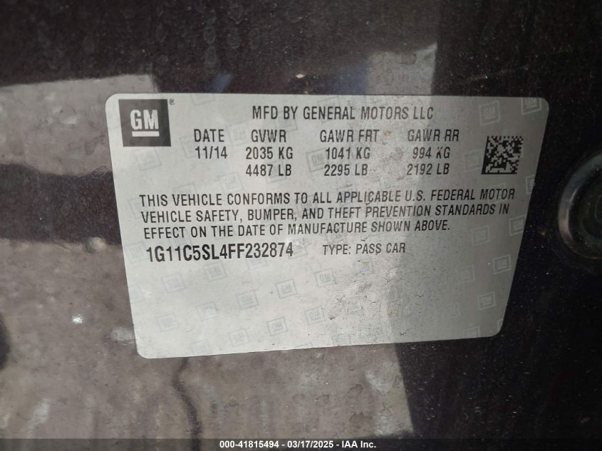 2015 CHEVROLET MALIBU 2015 Gasoline, 2.5, Front wheel drive, VIN - 1G11C5SL4FF****** from the USA
