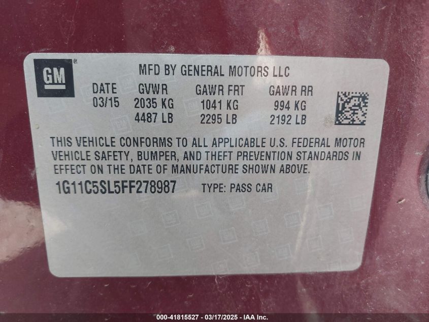 Color BurgundyCylinders 4Drive Front wheel driveVIN 1G11C5SL5FF******State Run & Drive VerifiedDamage Front left AutoRIA
