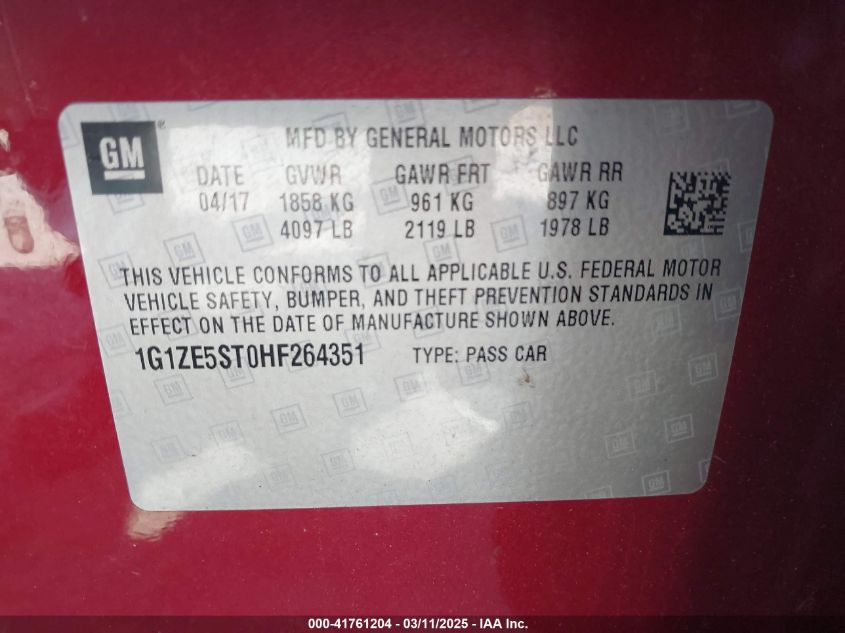 Color RedCylinders 4Drive Front wheel driveVIN 1G1ZE5ST0HF******State Run & Drive VerifiedDamage Back AutoRIA