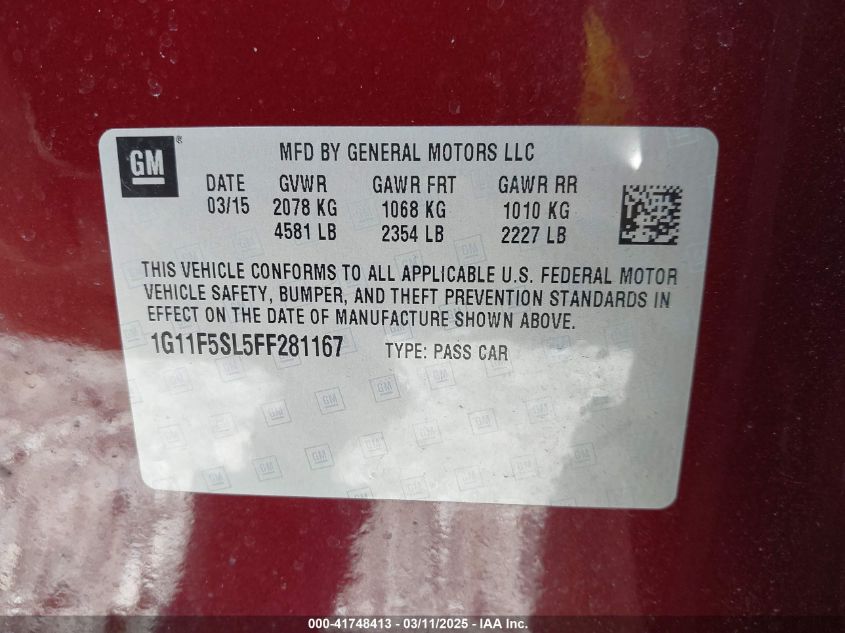 Color RedCylinders 4Drive Front wheel driveVIN 1G11F5SL5FF******State Run & Drive VerifiedDamage Front or back AutoRIA