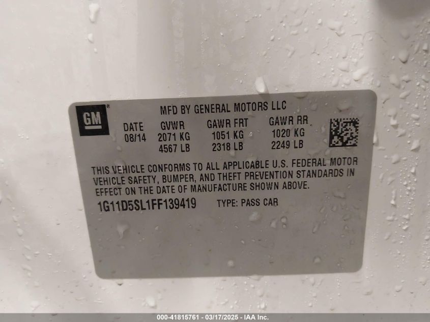 2015 CHEVROLET MALIBU 2015 Gasoline, 2.5, Front wheel drive, VIN - 1G11D5SL1FF****** from the USA