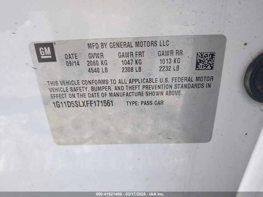 2015 CHEVROLET MALIBU 2015 Gasoline, 2.5, Front wheel drive, VIN - 1G11D5SLXFF****** from the USA
