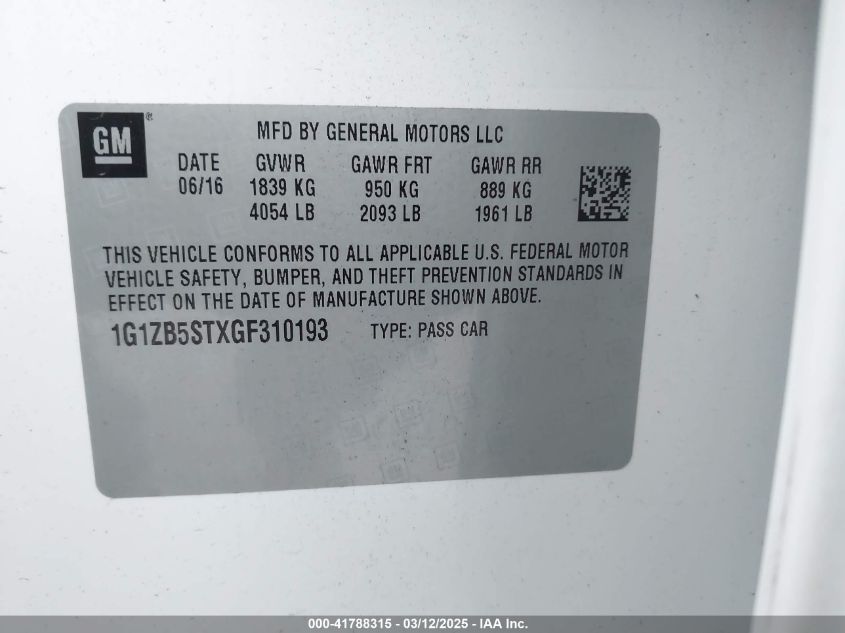 Color WhiteCylinders 4Drive Front wheel driveVIN 1G1ZB5STXGF******State Run & Drive VerifiedDamage Insignificant AutoRIA