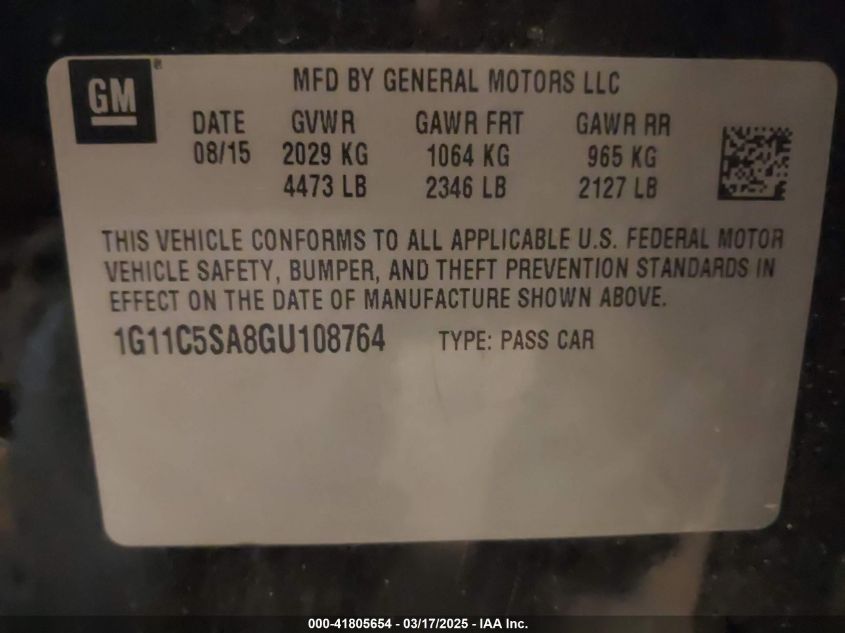 Color BlackCylinders 4Drive Front wheel driveVIN 1G11C5SA8GU******State Run & Drive VerifiedDamage Front and back AutoRIA