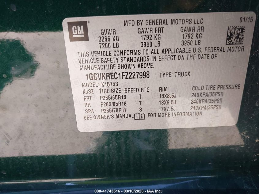 Color GreenCylinders 8Drive Full driveVIN 1GCVKREC1FZ******State Run & Drive VerifiedDamage Front or back
