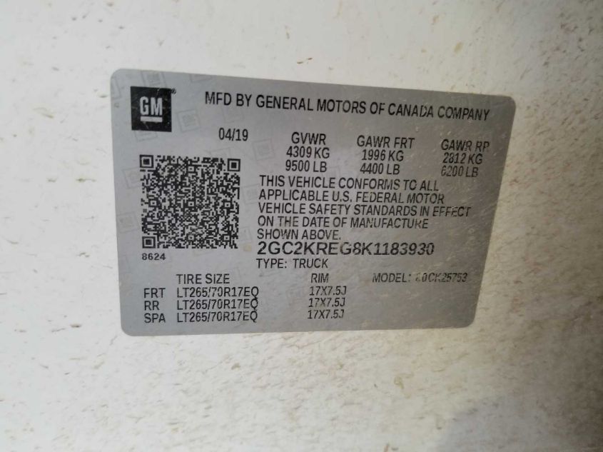 Color Cylinders 8Drive Full driveVIN 2GC2KREG8K1******State Run & Drive VerifiedDamage InsignificantAuction date 2025-06-01
