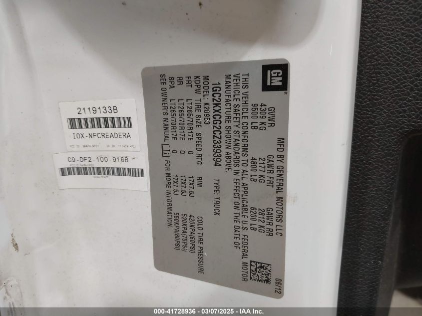 Color WhiteCylinders 8Drive Full driveVIN 1GC2KXCG2CZ******State Run & Drive VerifiedDamage Front rightAuction date 2025-03-26
