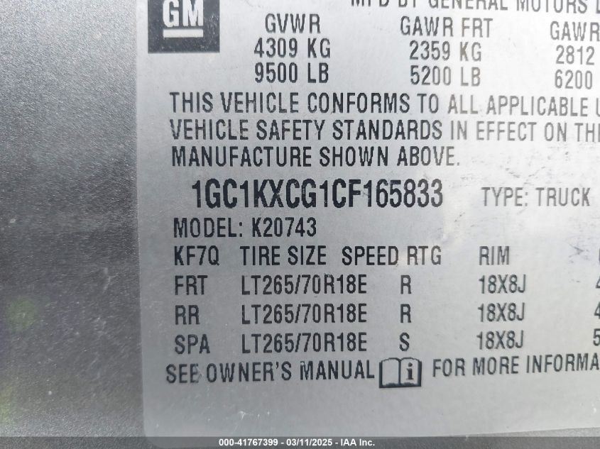 Color SilverCylinders 8Drive Full driveVIN 1GC1KXCG1CF******State Run & Drive VerifiedDamage Front or backAuction date 2025-03-25