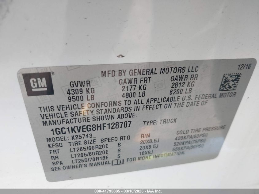Color WhiteCylinders 8Drive Full driveVIN 1GC1KVEG8HF******State Run & Drive VerifiedDamage Front or backAuction date 2025-03-27