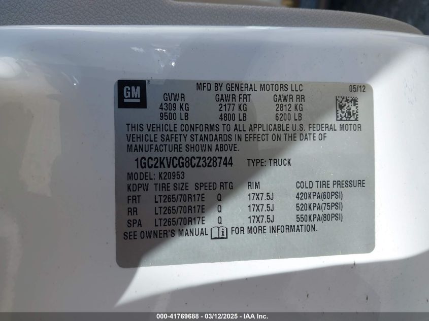 Color WhiteCylinders 8Drive Full driveVIN 1GC2KVCG8CZ******State Run & Drive VerifiedDamage Front leftAuction date 2025-03-27
