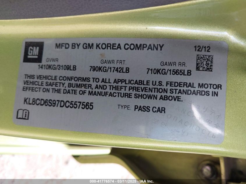 2013 CHEVROLET SPARK 2013 Gasoline, 1.2, Front wheel drive, VIN - KL8CD6S97DC****** from the USA