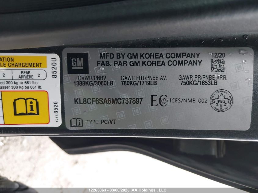 Color GrayCylinders 4Drive UnknownVIN KL8CF6SA6MC******State Run & Drive VerifiedDamage Front rightAuction date 2025-03-21 AutoRIA