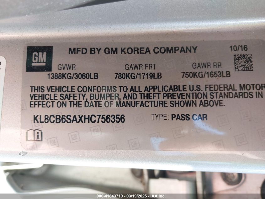 Color SilverCylinders 4Drive Front wheel driveVIN KL8CB6SAXHC******State Run & Drive VerifiedDamage Front or back AutoRIA