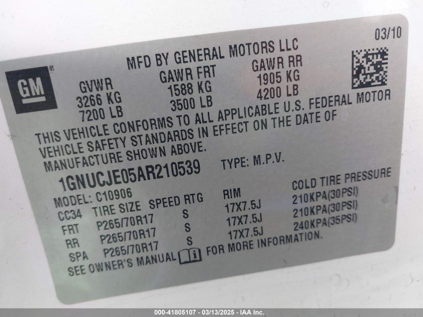 Color WhiteCylinders 8Drive UnknownVIN 1GNUCJE05AR******State Run & Drive VerifiedDamage From the sidesAuction date 2025-03-25 AutoRIA